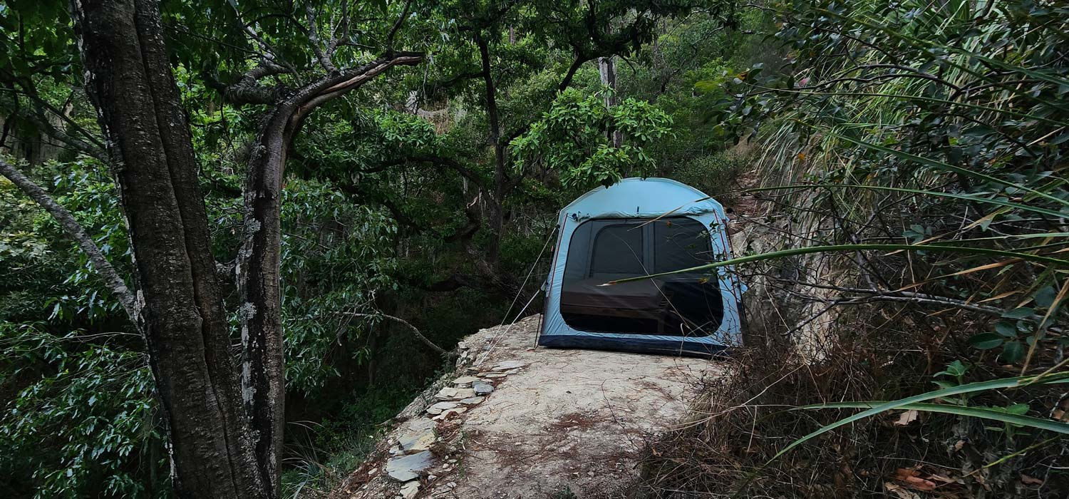 Acampar como diós manda. Casa de campaña XL, cama estilo hotel, electricidad e internet.